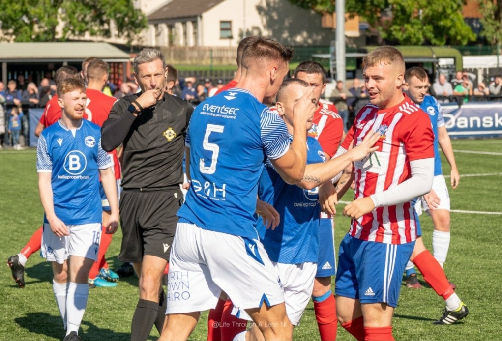Ryan Arthur and Reece Neale were keen to get a point across during some handbags in the first half at the Bluebell. Image from Life Through a Lens NI.
