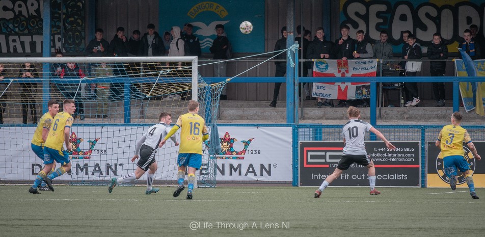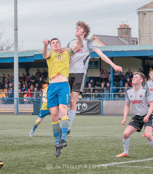 A player who has made no bones about his wish to add to his goal tally this season, Ryan Arthur was back in the starting line-up and almost delivered a finish when Dean Smyth was forced into a one-handed wonder save to deny the defender. Image from Jordan Connolly/Life Through A Lens NI.