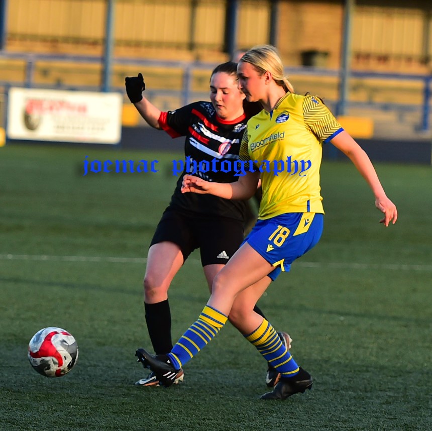 After Ballyclare Comrades had established their two-goal cushion early in the encounter on Wednesday night, Olivia Brown played a central role in the Bangor FC Ladies response. It was her who won the penalty, which Amber Dempster converted with aplomb to cut the deficit in half, before her composure in a time-constrained and pressure situation ensured she was able to finish and level the match when the ball fell to her in the penalty area. Image from Jordan Connolly/Life Through A Lens NI.