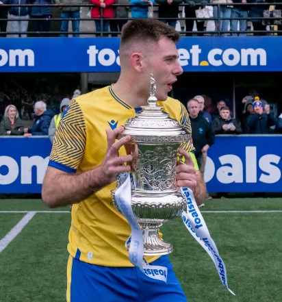 Midfielder Lewis Harrison, who has now served in Bangor’s colours for three-and-a-half years now having linked up just before Covid pulled the curtain prematurely on the 2019/20 campaign, can count himself a double-winning captain just as Tommy Wray was in 2019. He also put ghosts to bed when he atoned for defeat in the Steel decider six years prior by setting up Ben Arthurs’ leveller against Dunmurry Rec. Image from Sarah Harkness.