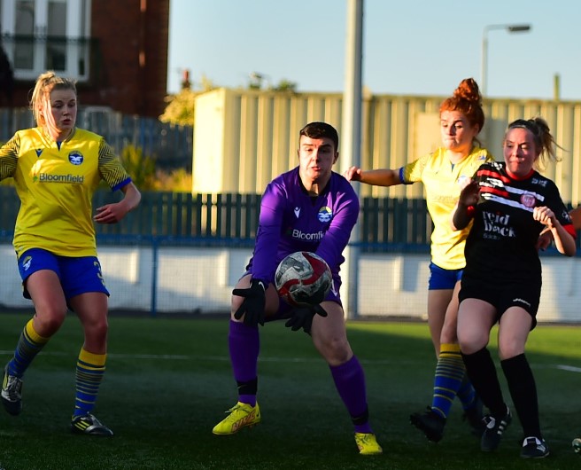 “We’d started quite fast, probably as fast as we’ve began all season, set a good tempo and then when the first goal went in, as a collective the heads just seemed to drop. We had started to get a bit sloppy in our passing, we were giving the ball away cheaply, making mistakes and it just wasn’t clicking for us” – there was a sense of disappointment from goalkeeper Giulia McLaughlin after a first half that saw Bangor FC Ladies down four goals by the interval. Image from Sarah Harkness.
