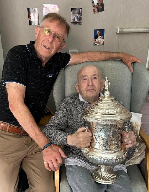 Bangor supporter William Gilpin is pictured with Alan McKinney, who beamed as he got his hands on the Steel and Sons Cup in the week. Image from Bangor FC Social Media.