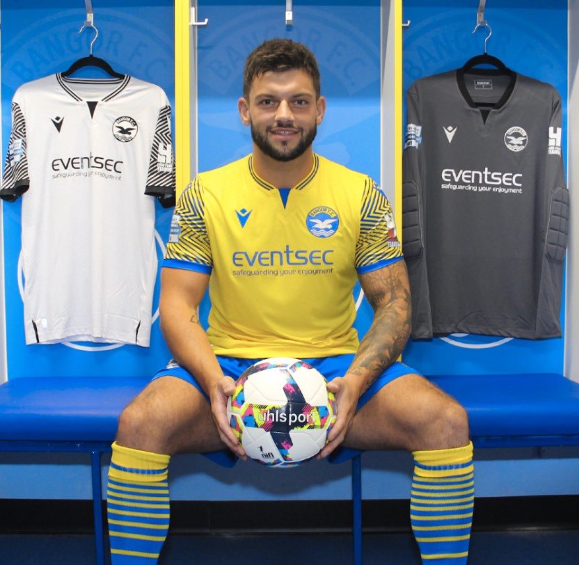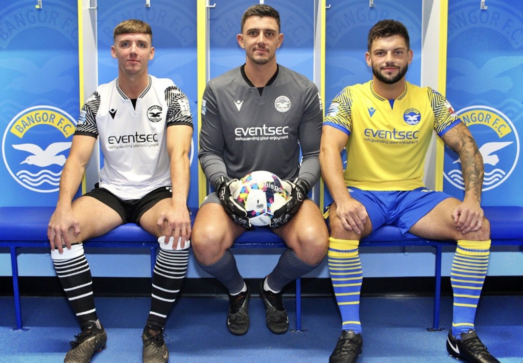 With Eventsec the new front-of-shirt sponsor for Bangor, there is a sense of familiarity about this year’s design which Adam Neale modelled during the week. The blue-on-yellow blend of the sponsor came in for particular rave reviews among supporters on social media. Image from Bangor FC Social Media.