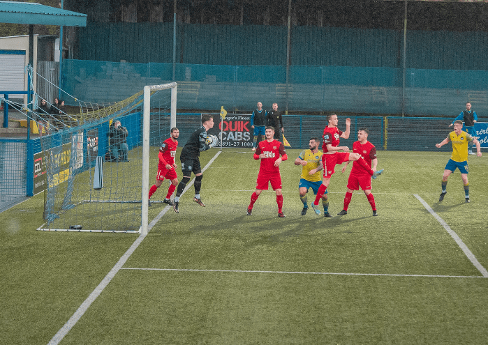 It was a sweet delivery in from the left by Ben Cushnie and a well-placed header from Ben Arthurs to cut Dundela’s lead in half, the Kircubbin striker glancing his header across the face of goal and seeing his shot head in off the frame to bring the Seasiders back within one. Image from Jordan Connolly/Life Through A Lens NI.