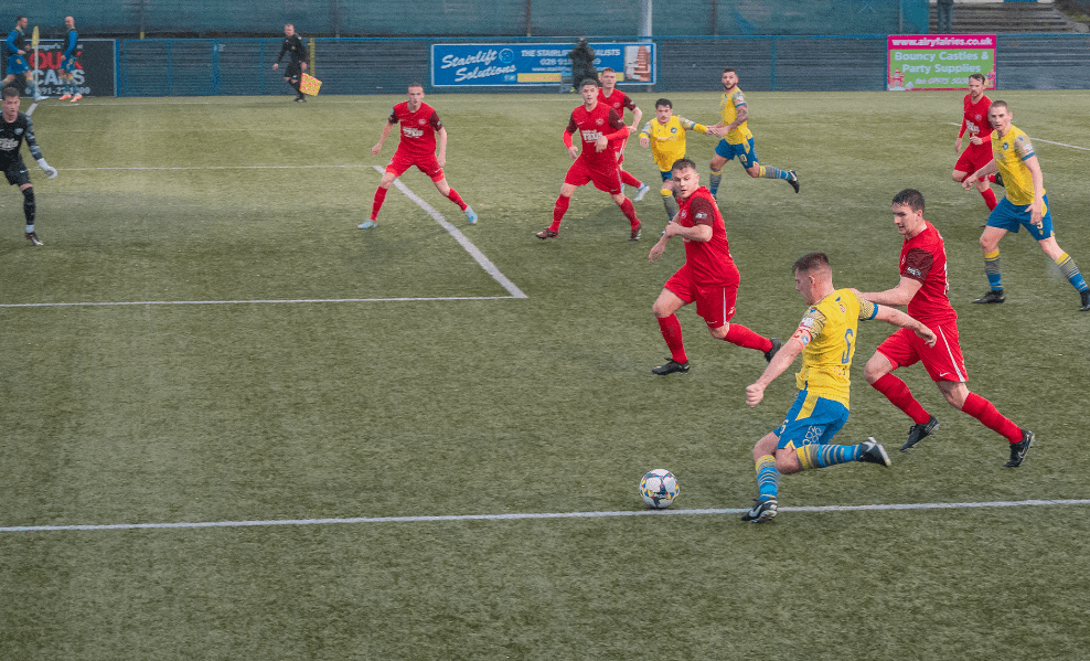 As the Yellows aimed to regroup, frontman Rea – another with old Mourneview connections who arrived at Wilgar Park after a half-season stint in the Amateur League with Shankill United – took coolly in his stride behind the defensive line. Shaping up his shot, he pierced low into the bottom right corner with the composure of a saint to break the deadlock.