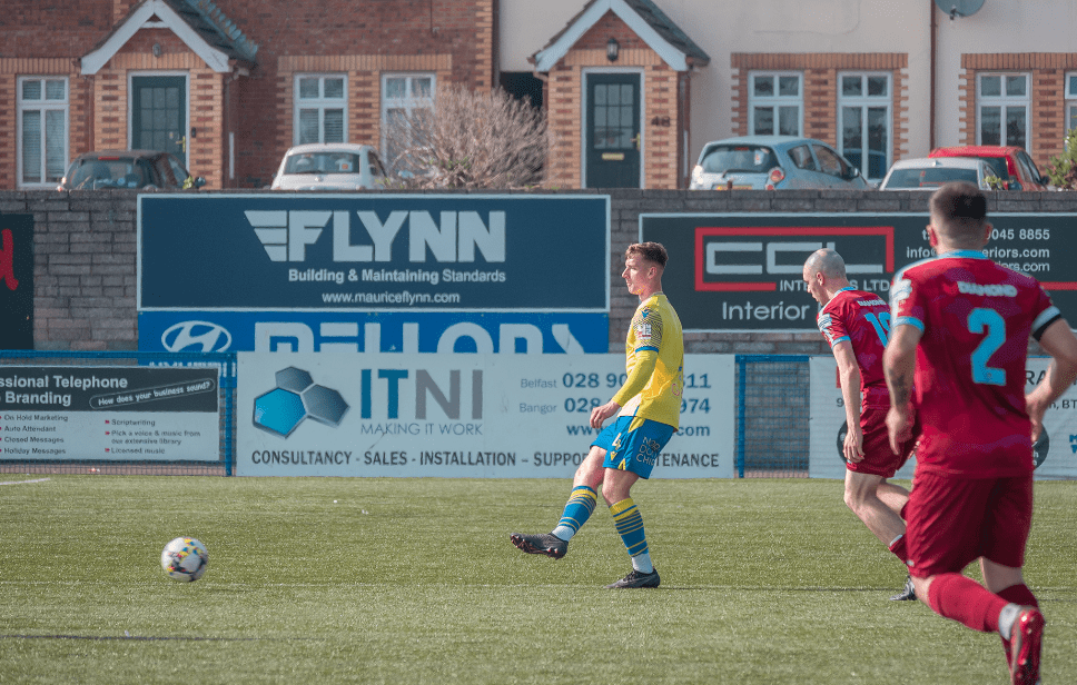 “Yeah, well I think the way we started the game, we didn’t start too well. We regrouped at half-time, came out, thought the first five minutes (of the second half) we played more like we could, more like we know we can, dealt with the (Institute) goal and then kicked on. We tried to play well but I think when we analyse the footage back, we can’t do that (start games slowly)” – defender Lewis Francis kept his head firmly on his shoulders when reflecting on the contest between Bangor and Institute. Image from Jordan Connolly/Life Through A Lens NI.