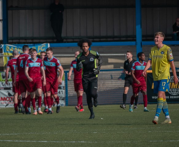 Bangor defender Sean Brown cuts a dejected figure while the players of Institute celebrate their team’s opening goal just before the hour mark. It was Kirk McLaughlin, who Bangor faced as a Glentoran II player in the Steel and Sons Cup last-16, who drove ‘Stute into the lead. Image from Jordan Connolly/Life Through A Lens NI.