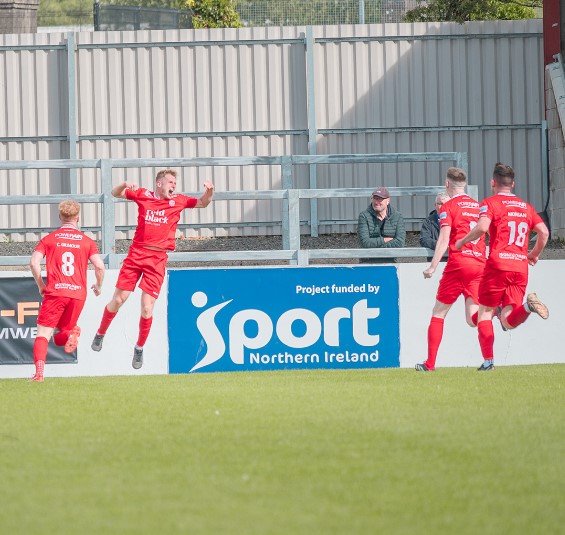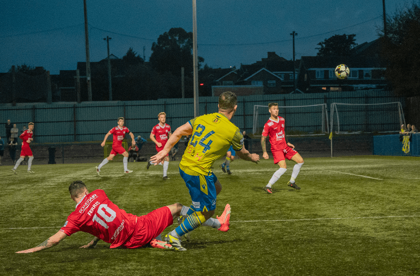 Before and after that flashpoint were home chances. On 57 minutes, Ballyclare were forced into hooking the ball onto the top of the net, while with 65 gone, Arthurs clipped the outside of the post after pipping McDowell to the punch from local lad Walker’s dime of a delivery.