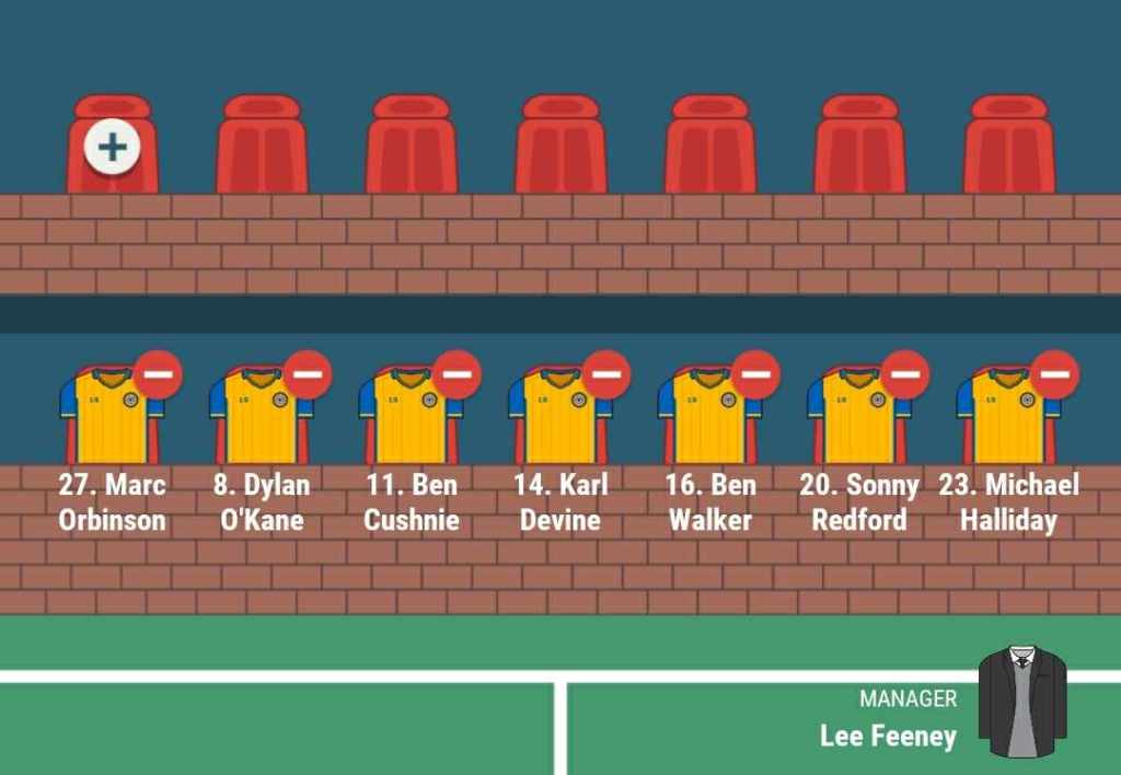 Among the batch of seven who Feeney could call on to make an impact, highly-rated striker Sonny Redford (17) was included in his first senior matchday squad this term, eager to build on his two first-team appearances to date towards the end of last campaign. Karl Devine’s return was also to bolster the midfield options alongside O’Kane.