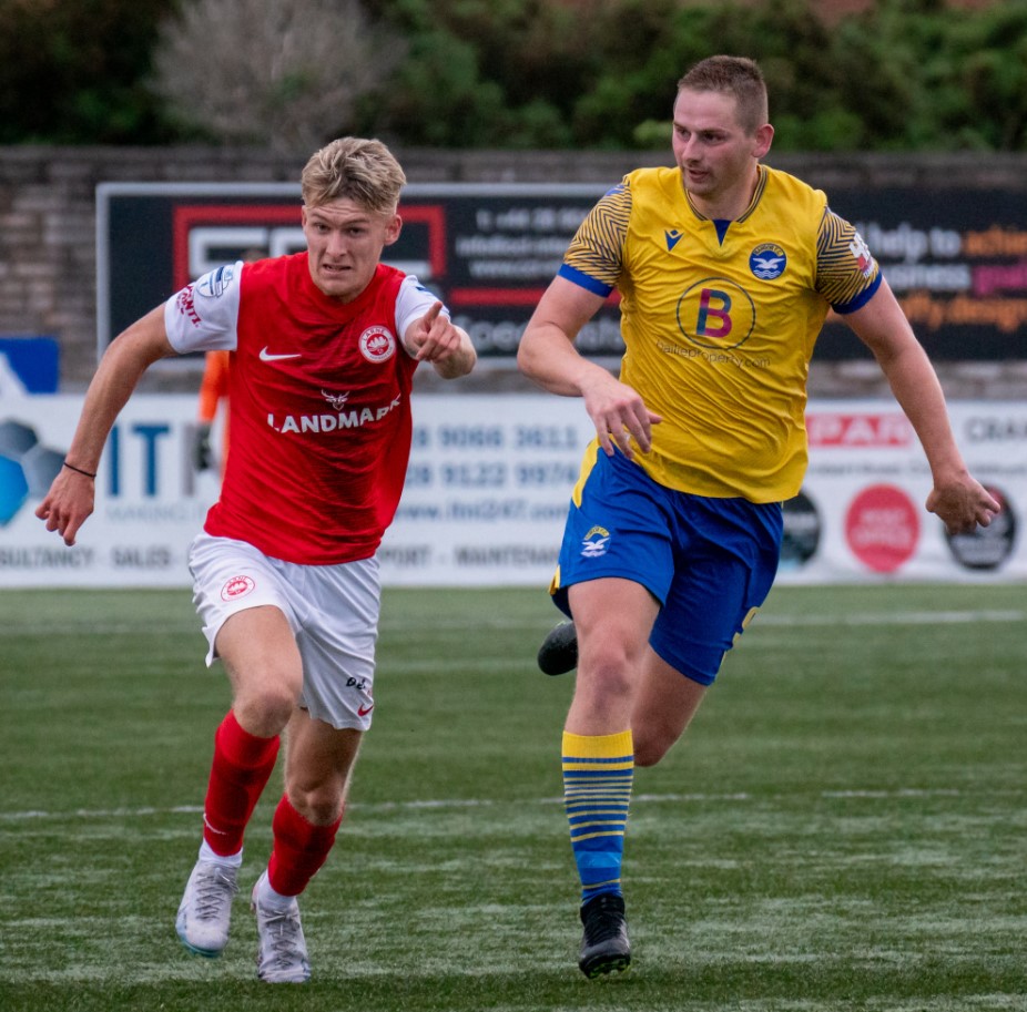 After delivering four goals to down Ballyclare Comrades, Ben Arthurs will return to east Antrim with fuel in the fire to make a difference against Larne at Inver Park. The Kircubbin striker is likely to face another Peninsula-refined talent in Newtownards youngster Dylan Sloan, who has established himself in Larne’s midfield of late. Image from Sarah Harkness.