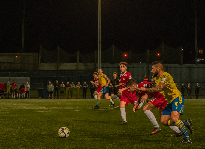 In what was arguably the move of the match, the combination between Dylan O’Kane and Ben Cushnie for the clinching third Bangor goal against Ballinamallard was an incisive piece of play that proves how the Seasiders can create chances and ask questions of teams. Image from Jordan Connolly/Life Through A Lens NI.