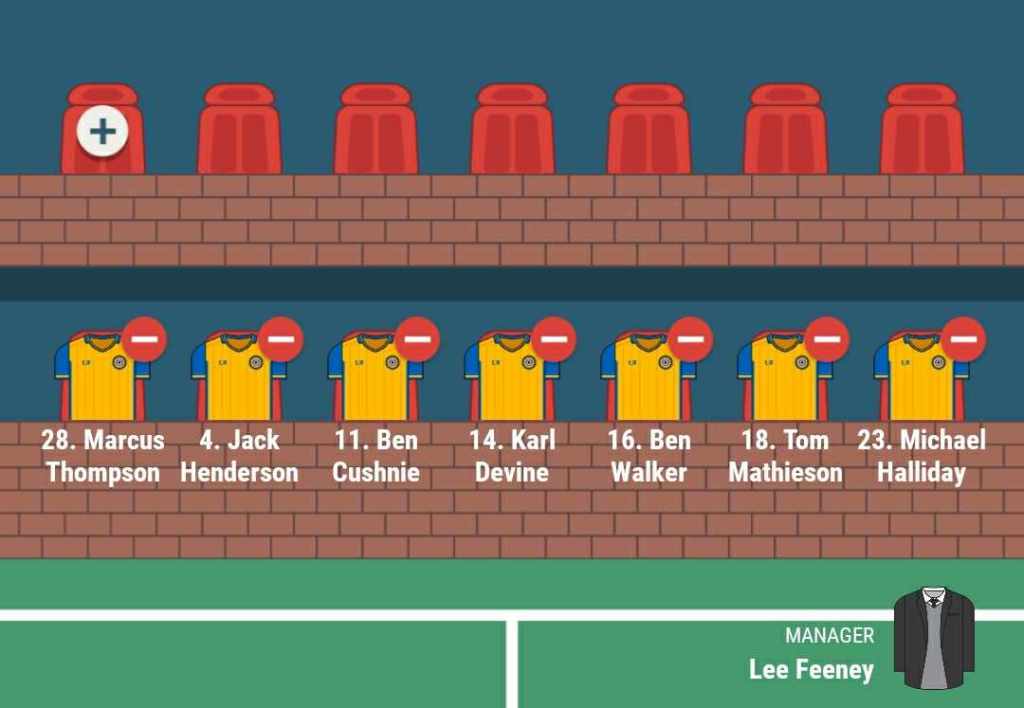 Of those to drop out, James Taylor’s commitments elsewhere meant it was a second straight matchday squad appearance for teenage stopper Marcus Thompson, while Jack Henderson and Ben Cushnie were both included on the bench. Image from myself.