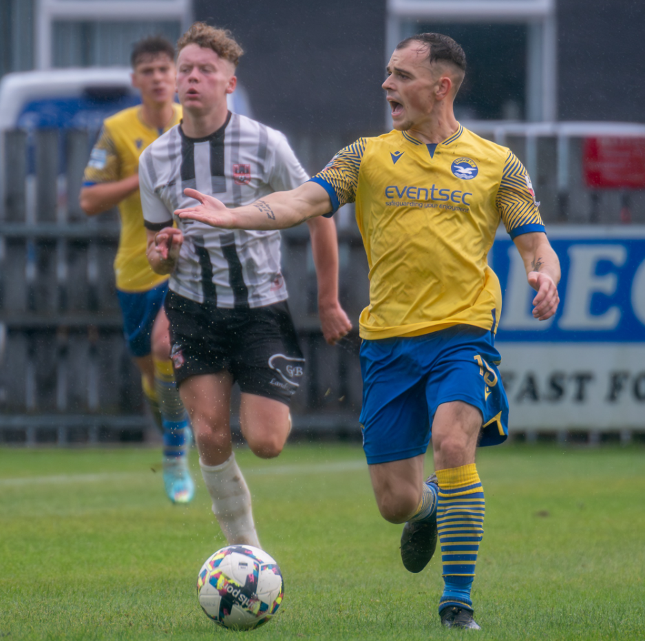 “The first 20 minutes, we started on the front foot, we were playing well, we got the goal and we were in a good position. But after that, we let our guard down, we let them (Dergview) get on top of us and impose the game on us, and they made it tough” – Bangor captain Lewis Harrison admitted there was a drop-off after the Seasiders had opened the scoring at Darragh Park. Image from Gary Carson.