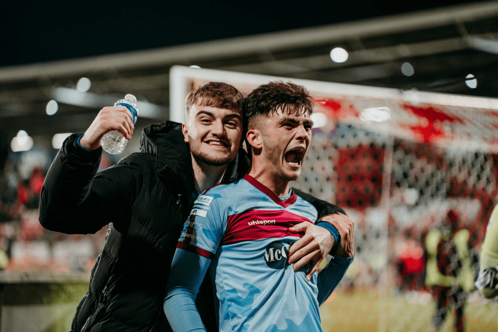 ‘Stute were in fifth when the clock entered the red, but when Michael Harris powered home, firing across lanky centre-back Brandon Diau and in at Gareth Buchanan’s far post having been slipped in by Shane McGinty, the sheer scenes of jubilation sparked among the north west club’s travelling faithful could be juxtaposed with the sighs and groans from just down the Tandragee Road where all inside learned Kevin Deery’s men had shot into second.